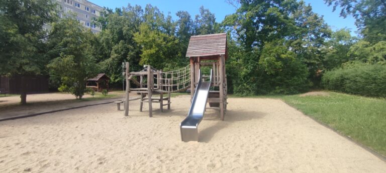 Wir konnten durch zahlreiche Sponsoren eine neue Spielplatzkombination finanzieren. Es entstand ein Kletterturm mit Brücke, Sandaufzug und Rutsche.
